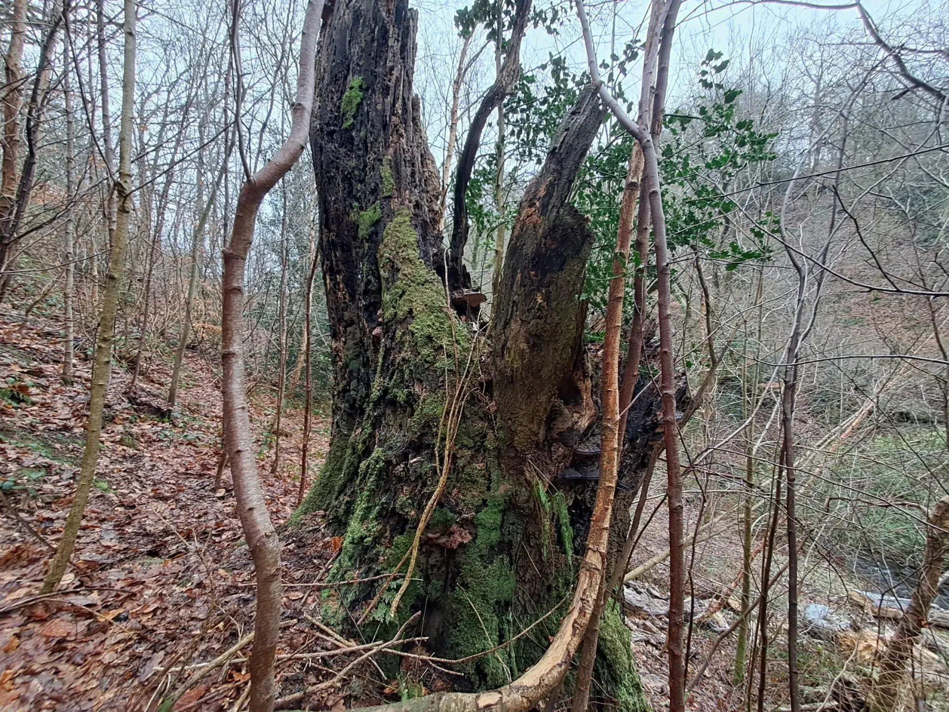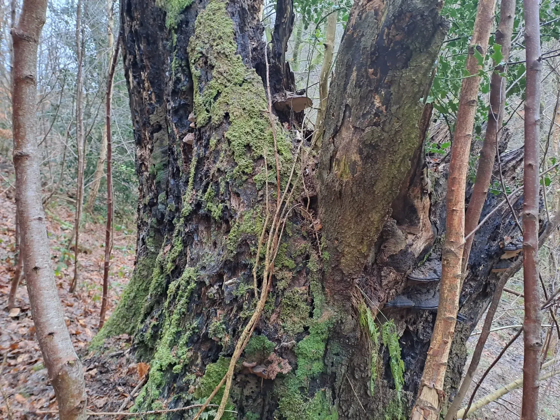 Many of the trees were in decline or already dead, with one particularly large common beech tree having succumbed to advanced decay, and also had several fruiting bodies of bracket fungus ( Ganoderma sp.). This recently deceased tree had left a significant gap in the canopy, giving some indication of how large this tree would have been in its prime.