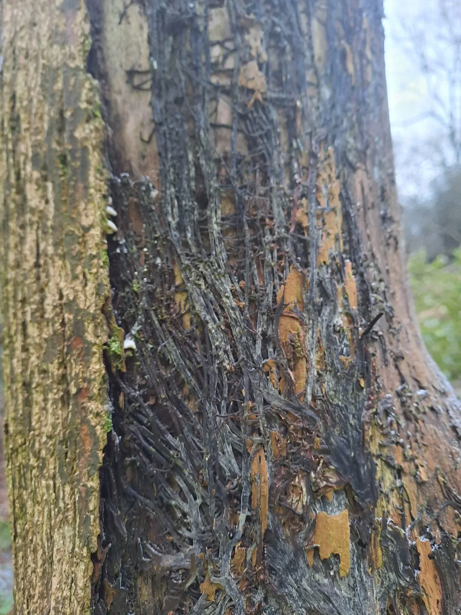 rhizomorphs covering the internal bark of several trees and decaying wood on the woodland floor.