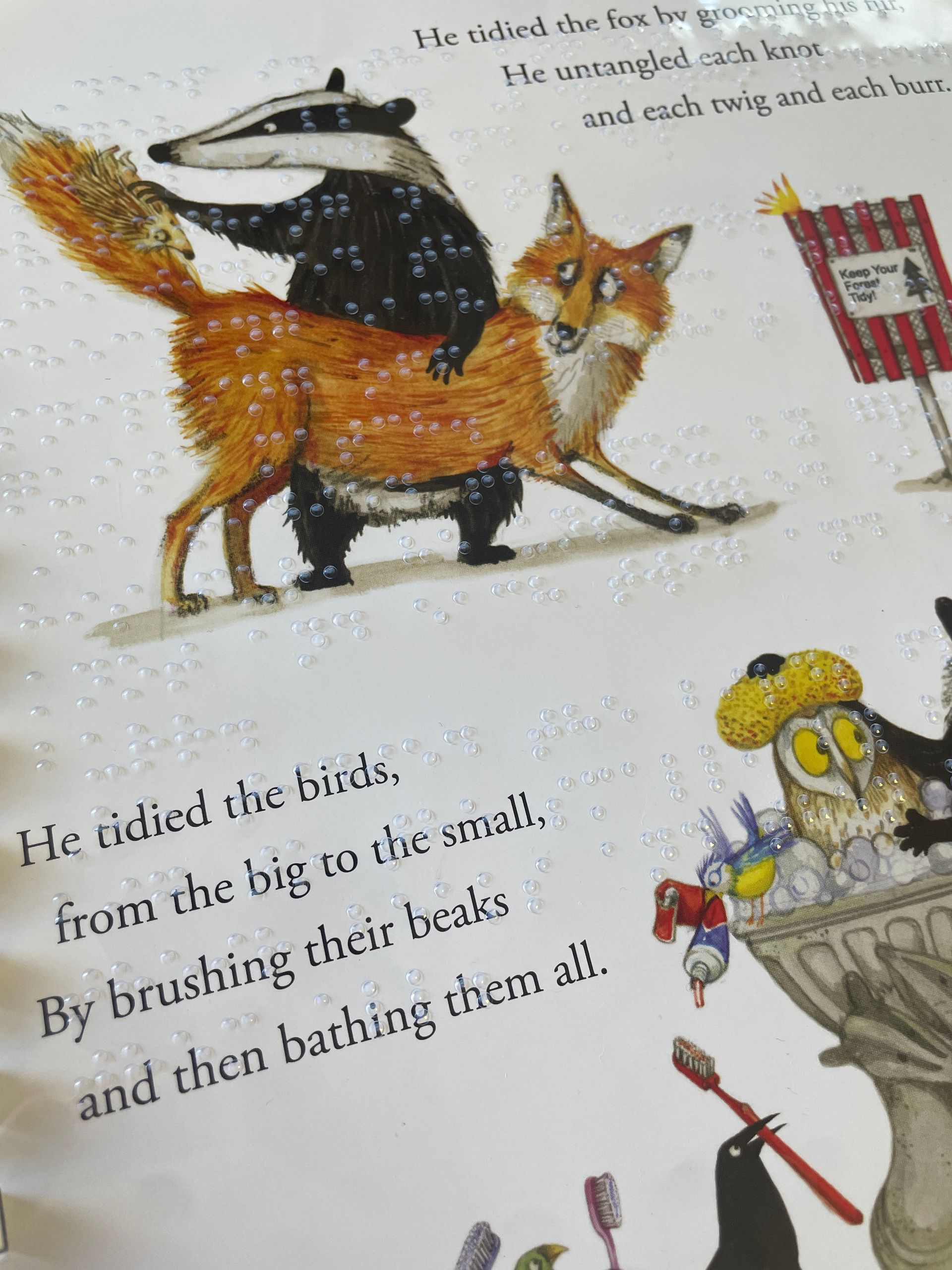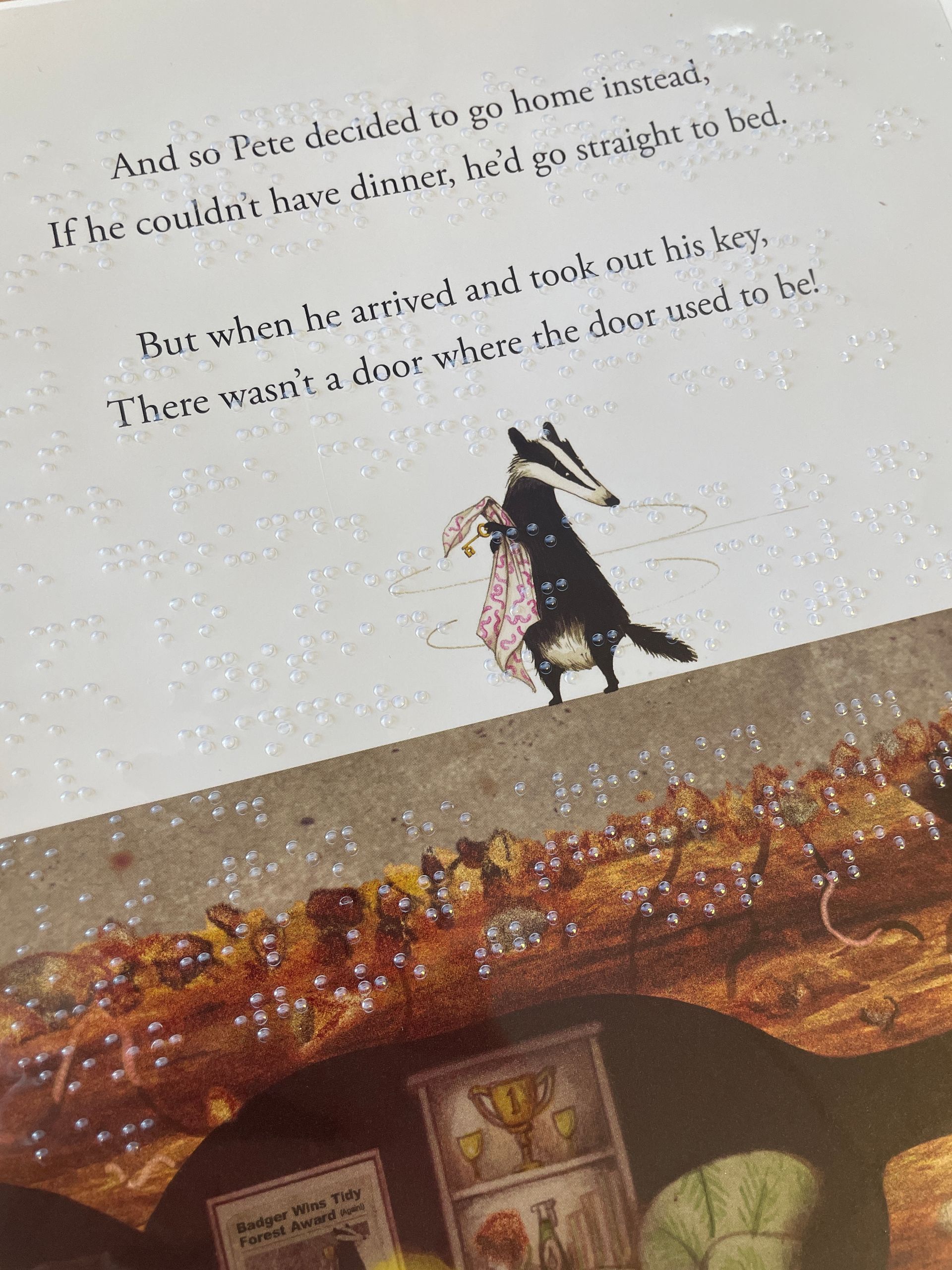 The adaptation process brings the story into a new format. Key illustrations were recreated as raised tactile images, formed from hand-carved masters and carefully hand-painted by volunteers. These sit alongside transparent braille overlays, allowing children to read independently while building confidence in braille literacy. An accompanying audio guide, voiced by Sean Bean, adds description and context, guiding children through each page and bringing the illustrations to life through touch and sound.