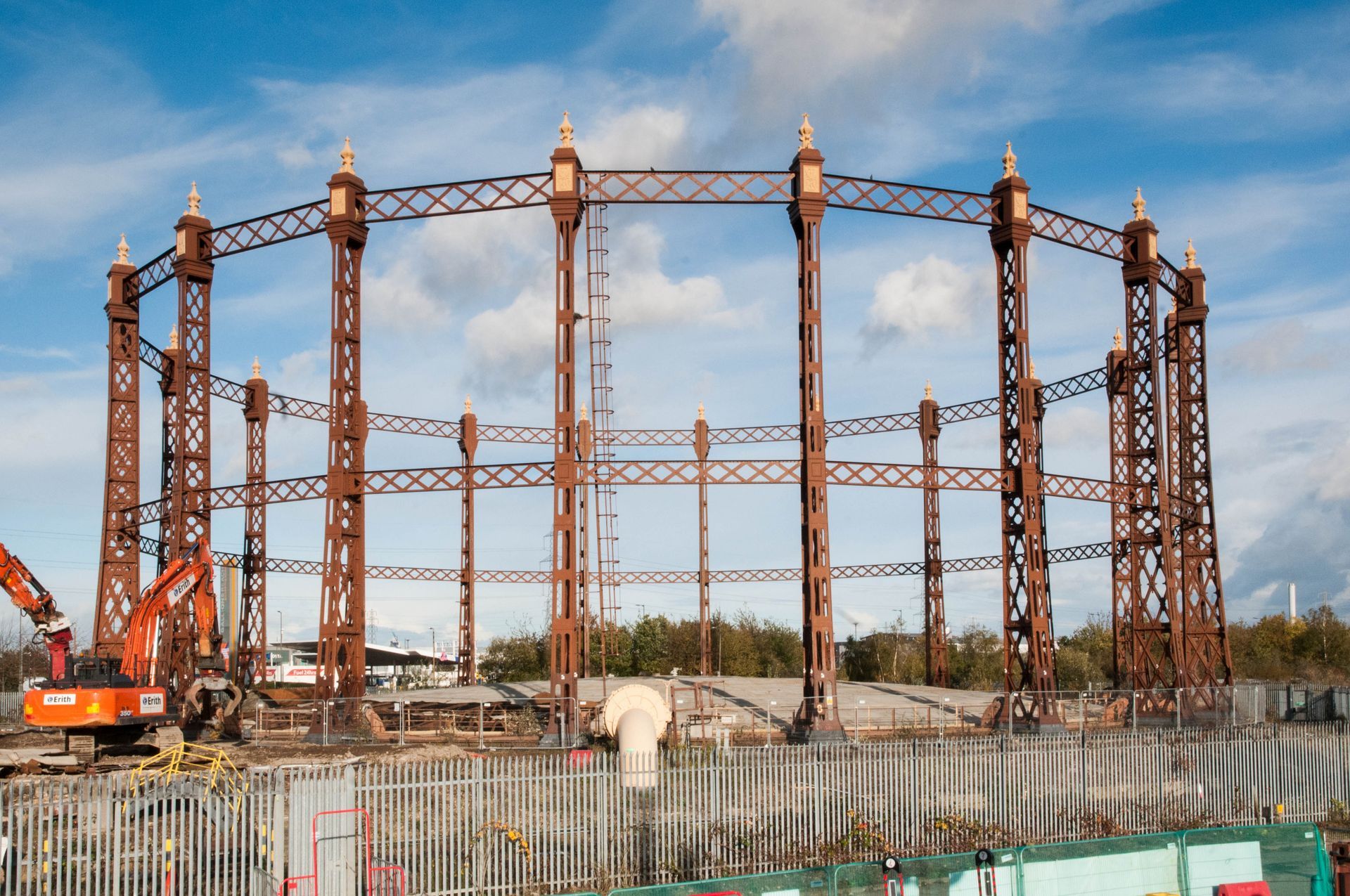 Constructed in 1870, the gasworks expanded in phases to include nine gasholders, each increasing storage capacity. Gasholders 7 and 8 were built in 1876, designed by engineer Vitruvius Wyatt, with Gasholder 7 rebuilt as a spirally-guided gasholder in the 1940s. The gasholders originally featured cast-iron standards with decorative finials and entablature boxes, which were carefully recorded.