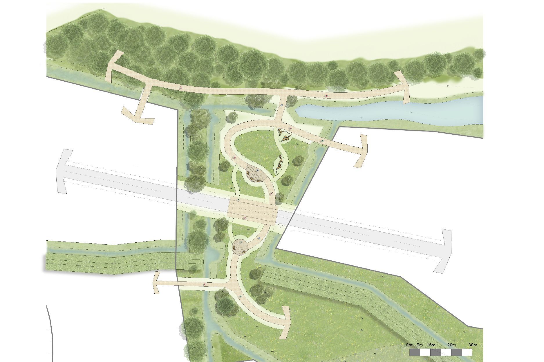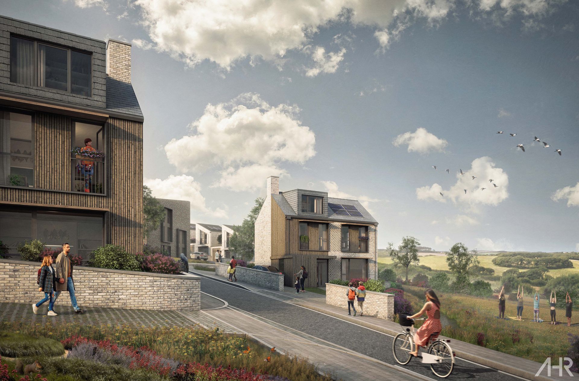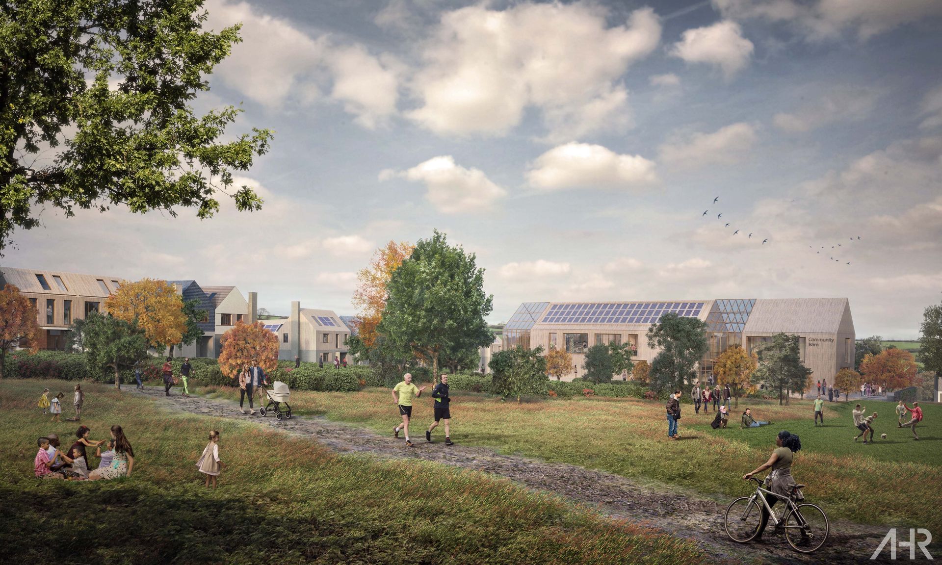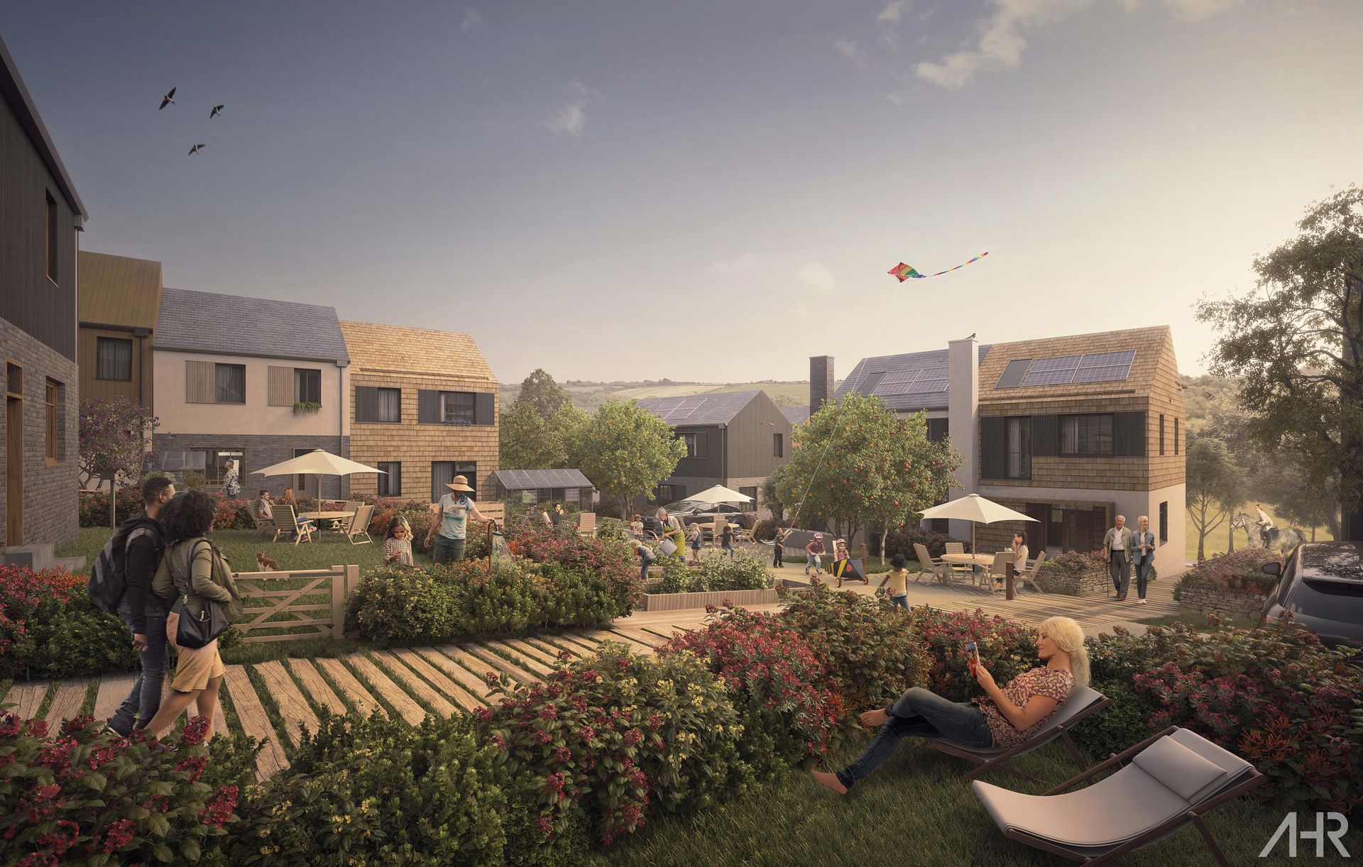 The landscape strategy establishes a multifunctional network of green and blue spaces that provide recreation, wildlife habitat, active travel routes and stormwater management. Significant new woodland planting contributes to the Forest of Cornwall while open spaces are designed to support play, community use and ecological connectivity.