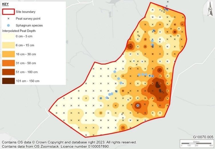 An interpolated peat depth map was produced, along with other outputs, in a bespoke webmap form for ease of access for the client, along with a detailed drainage feature, peat and soil survey report.